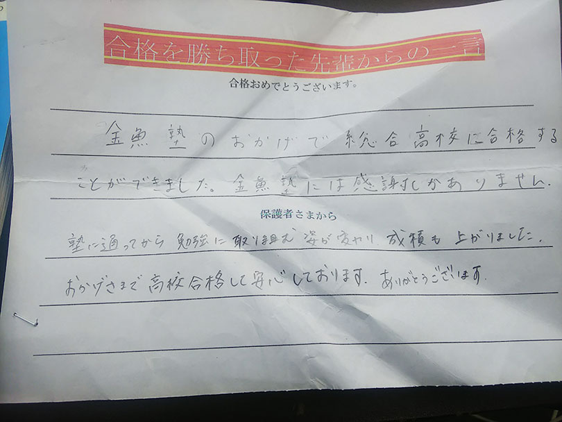 ツイート 2020年4月1日 カテゴリ お知らせ 合格おめでとうございます。 生徒ご本人から 金魚塾のおかげで総合高校に合格することができました。金魚塾には感謝しかありません。 保護者さまから 塾に通ってから勉強に取り組む姿が変わり、成績も上がりました。おかげさまで高校合格して安心しております。ありがとうございます。 新潟県佐渡市の学習塾・家庭教師金魚先生www.kingyo-un.com 〒952-0206新潟県佐渡市畑野甲537 TEL:0259-67-7287 ≪Next ネット授業の体験談 Prev≫ 合格を勝ち取った先輩からの一言 一覧へ戻る お問い合わせはこちら 0259-67-7287 Webでお問い合わせ